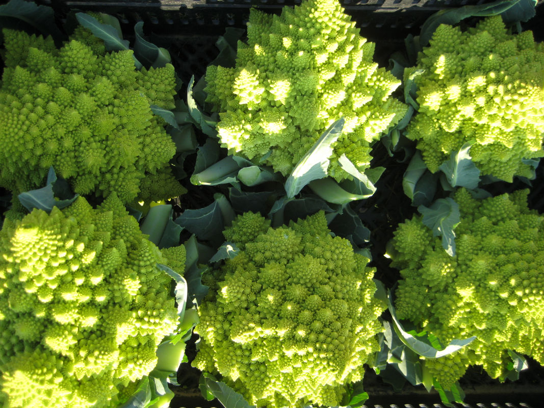 Long Island was famous for its cauliflower, and we insist the flavor when grown here is superior to anywhere else. We diverged from the white version to grow Romanesco cauliflower or Romanesco broccoli as it’s sometimes called. Not only is its chartreuse color striking, but its spiraled form is fantastic, and we like its crunchy texture and delicate, nutty flavor. As with cauliflower, it can be eaten raw or cooked.